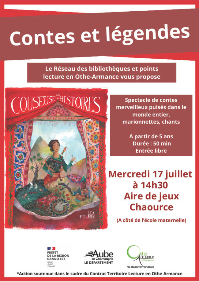 Le Réseau des bibliothèques et points lecture en Othe-Armance vous propose Spectacle de contes merveilleux puisés dans le monde entier, marionnettes, chants A partir de 5 ans – durée : 50 min Entrée libre Mercredi 17 juillet à 14h30 Aire de jeux de Chaource (A côté de l’école maternelle) *Action soutenue dans le cadre du…
