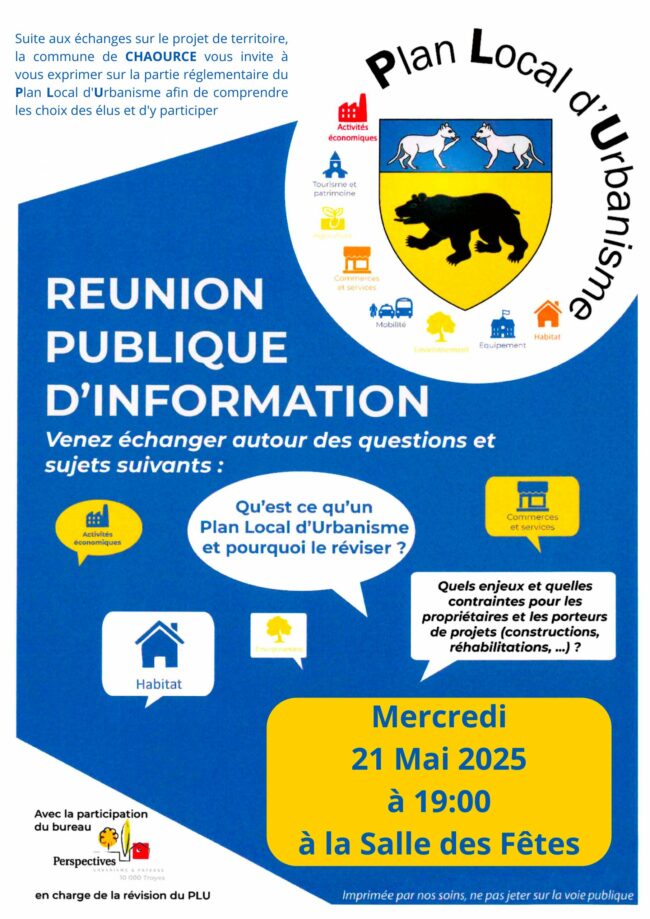PLU (Plan Local d’Urbanisme) : Réunion publique d’information Suite aux échanges sur le projet de territoire , la commune de Chaource vous invite à vous exprimer sur la partie réglementaire du Plan Local d’Urbanisme afin de comprendre les choix des élus et d’y participer. Venez échanger autour des questions et sujets suivants : => Quelles…