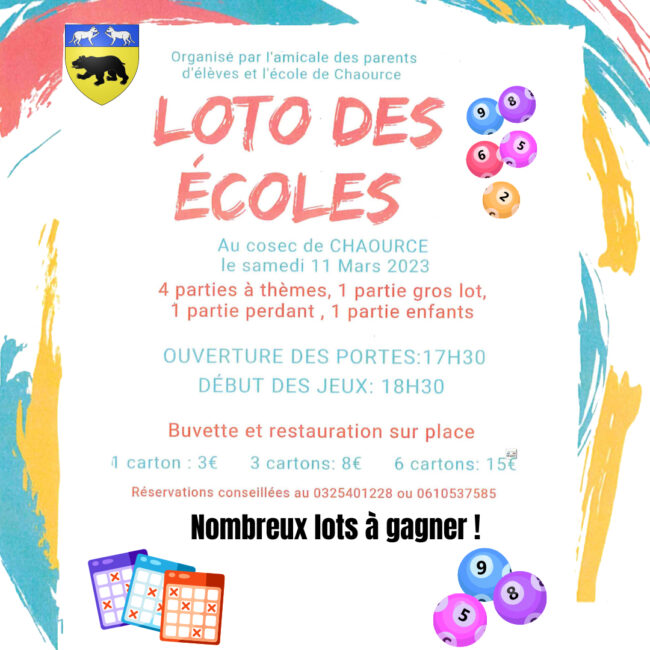Loto des écoles au Cosec de Chaource le samedi 11 Mars 2023 Organisé par l’Amicale des parents d’élèves et école de Chaource. 4 parties à thèmes, une partie gros lot, une partie perdant, une partie enfant. Ouverture des portes : 17:30 Début des jeux 18:30, buvette et restauration sur place. Carton : 3 € 3…