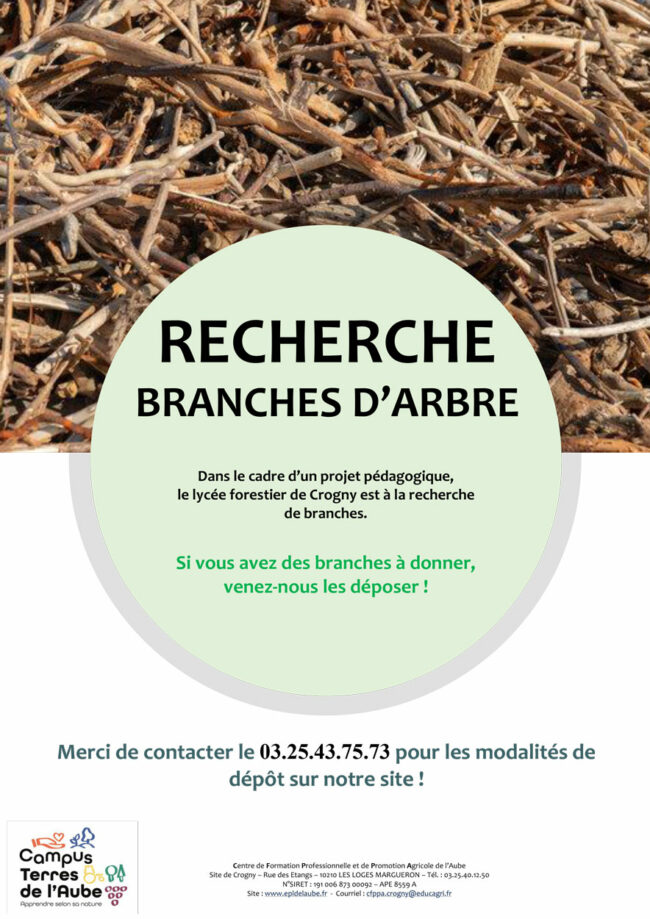Dans le cadre d’un projet pédagogique sur le lycée forestier de Crogny (10-Aube) nous sommes à la recherche de branches d’arbres. Merci de contacter le 03.25.43.75.73 pour les modalités sur notre site. Anaïs MORALES Chargée de missions Formations Professionnelles continues CFPPA DE L’AUBE – Site de Crogny Rue des Etangs 10210 LES LOGES MARGUERON Tél.…