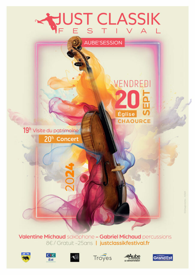 Vendredi 20 Septembre à l’église Saint Jean-Baptiste de Chaource 19:00 : Visite du Patrimoine 20:00 : Concert Just Classik Festival Valentine Michaud saxophone Gabriel Michaud percussions Entrée : 8€ Gratuit pour les – de 25 ans Web : justclassikfestival.fr