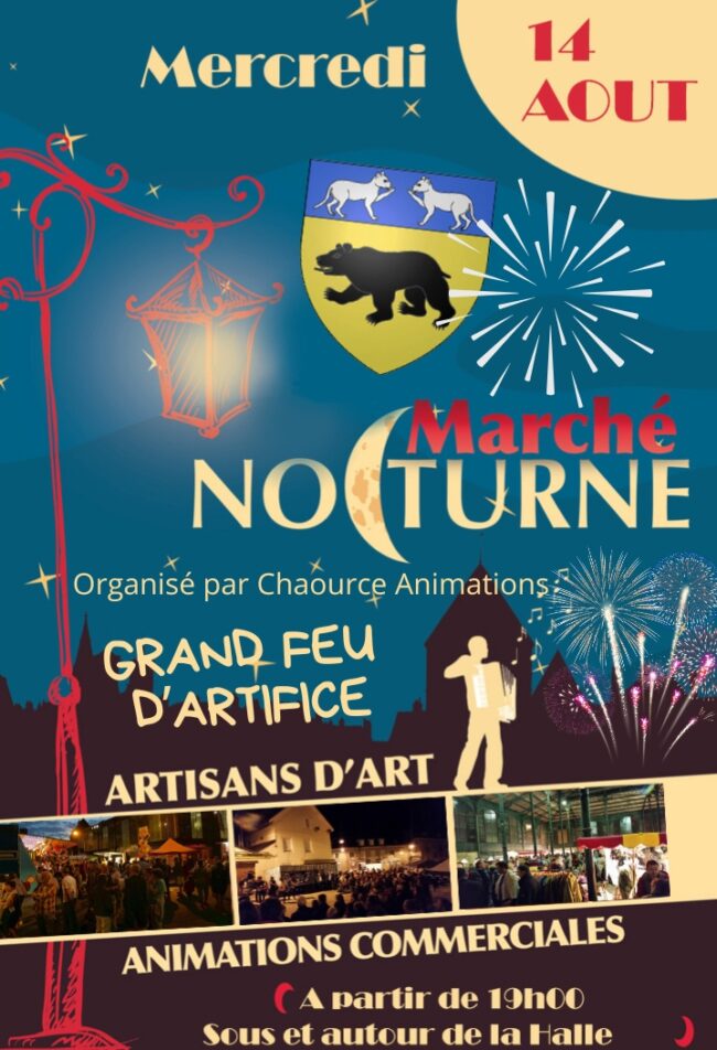 Mercredi 14 Août à Chaource… Marché nocturne, à partir de 19:00, à l’intérieur et autour de la Halle. Animations avec les différents groupes. Présentation de produits du terroir et d’artisanat d’art, animations pour enfants. Marché nocturne, à partir de 19:00, à l’intérieur et autour de la Halle Baltard de Chaource. Animations avec les différents groupes.…