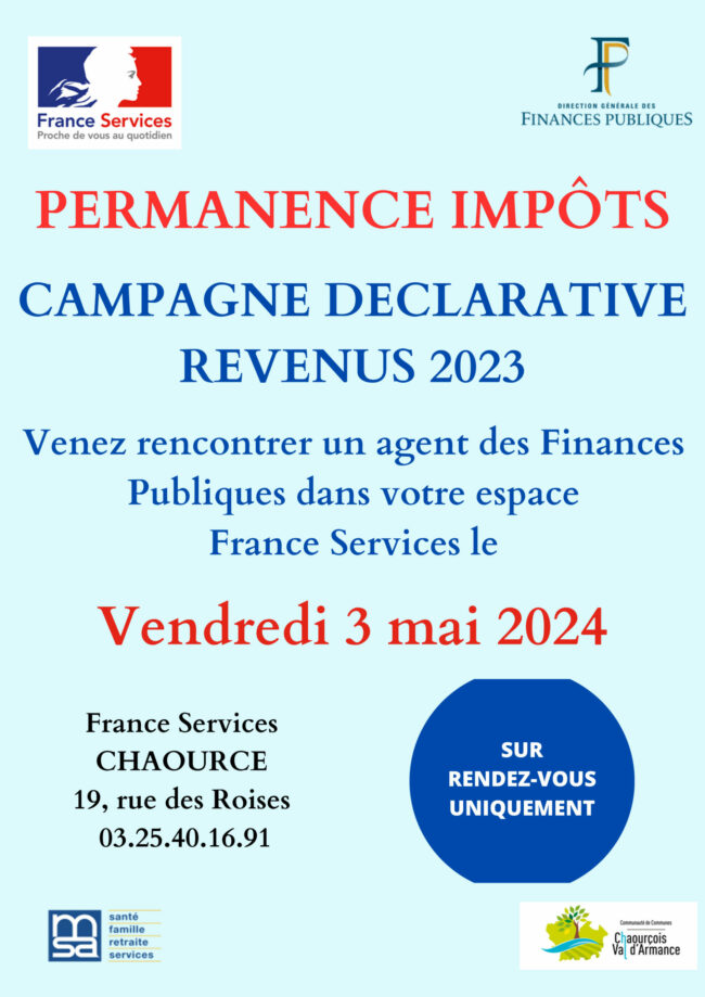 « Mesdames, Messieurs, Comme évoqué lors du dernier Conseil Communautaire du mardi 9 avril, des permanences DDFIP sont organisées au sein de nos espaces France Services de Chaource et d’Ervy-Le-Châtel dans le cadre de la campagne déclarative des revenus 2023. Celles-ci auront lieu : le vendredi 3 mai 2024 pour Chaource le mardi 14 mai pour Ervy-Le-Châtel Les…