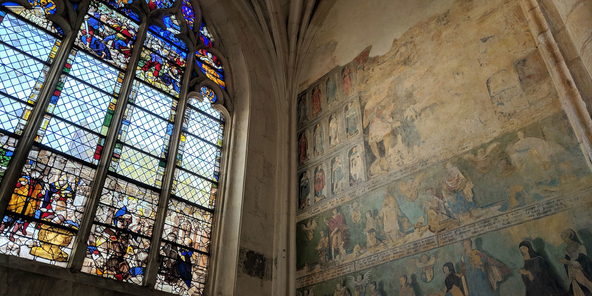 Trois impressionnants gardiens que l’on frôle en passant, en gardent l’entrée. Celui de droite vous dévisage au passage d’un œil inquisiteur. L’impression est saisissante. La lumière de cette chapelle est dispensée par deux lucarnes. La disposition de celles-ci par rapport à l’œuvre elle-même est fondamentale pour ressentir toute l’intensité dramatique qui se dégage du lieu.