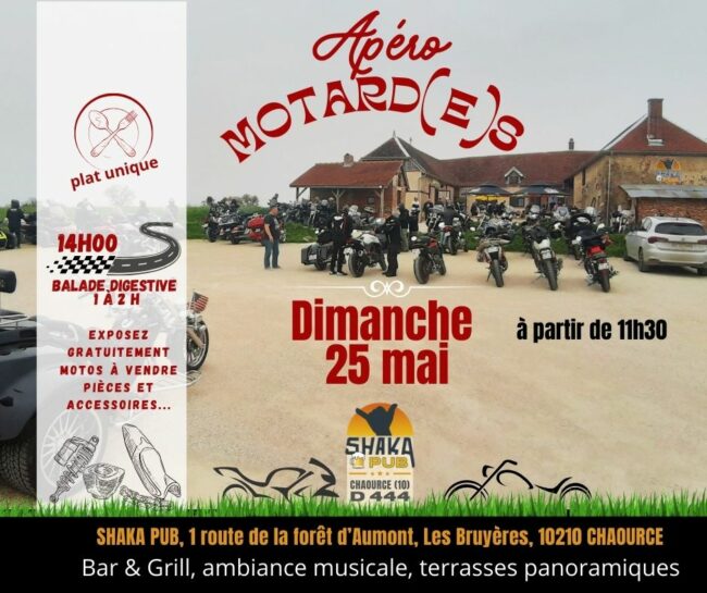 Dimanche 25 Mai à partir de 11:30 Exposez gratuitement ! Motos à vendre. Pièces & accessoires. Restauration sur place Réservation fortement conseillée ! Le Shaka Pub 📍: 1 route de la forêt d’Aumont, lieudit Les Bruyères, 10210 Chaource, France Tél : +33.6.20.59.71.38