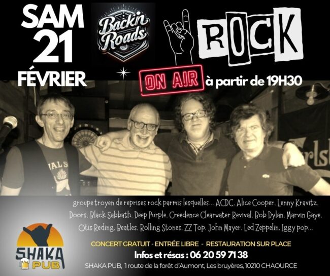 Shaka Pub’ : Rock on Air! Backin Roads à partir de 19:30 Groupe troyen de reprises Rock parmis lesquelles : ACDC / Alice Cooper /Lenny Kravitz / The Doors / Black Sabbath, Deep Purple / Creedence Clearwater Revival / Bob Dylan / Marvin Gaye / Otis Reding / The Beatles / The Rolling Stones /…