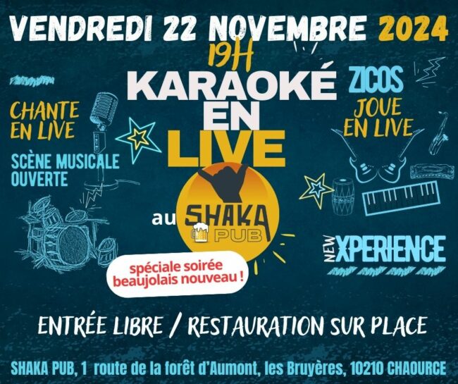 A partir de 19:00 Zicos joue en Live, chante en Live toi aussi ! Scène musicale ouverte. Soirée spéciale Beaujolais nouveau ! New Expérience. Entrée libre Restauration sur place Réservation fortement conseillée ! Le Shaka Pub 📍: 1 route de la forêt d’Aumont, lieudit Les Bruyères, 10210 Chaource, France Tél : +33.6.20.59.71.38