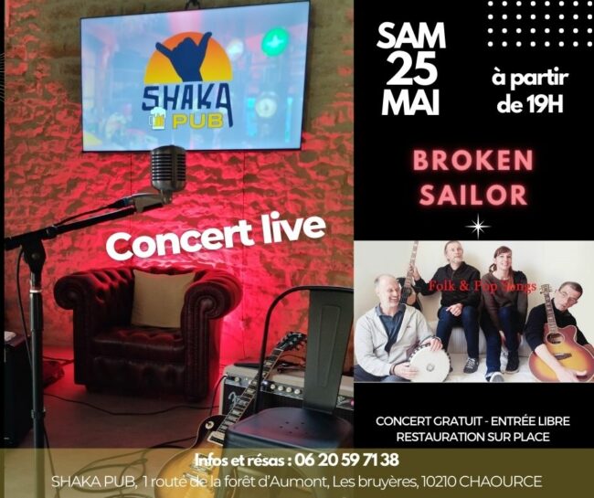 25 Mai à partir de 19:00 Concert Live : Broken Sailor – Folk & Pop Swings Concert gratuit Entrée libre Restauration sur place Le Shaka Pub 📍: 1 route de la forêt d’Aumont, lieudit Les Bruyères, 10210 Chaource, France Tél : +33.6.20.59.71.38