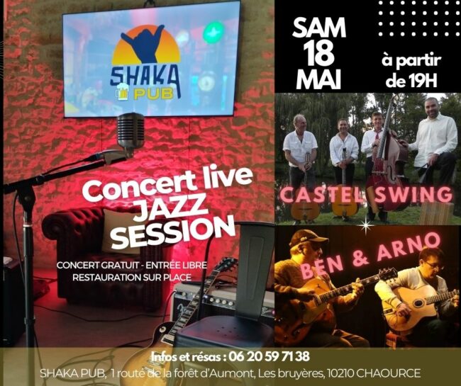18 Mai à partir de 19:00 Concert Live : Jazz Session Castel Swing – Ben & Arno Concert gratuit Entrée libre Restauration sur place Le Shaka Pub 📍: 1 route de la forêt d’Aumont, lieudit Les Bruyères, 10210 Chaource, France Tél : +33.6.20.59.71.38