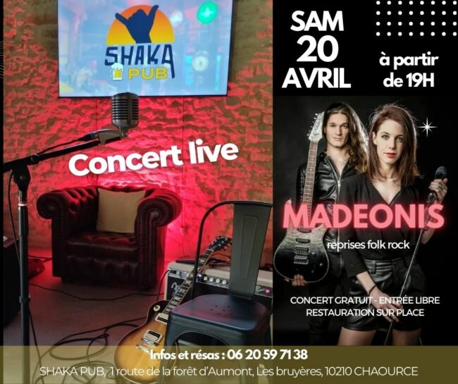 20 Avril à partir de 19:00 Concert Live : Madeonis : reprise Folk Rock Concert gratuit Entrée libre Restauration sur place Le Shaka Pub 📍: 1 route de la forêt d’Aumont, lieudit Les Bruyères, 10210 Chaource, France Tél : +33.6.20.59.71.38