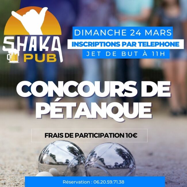 Dimanche 24 Mars Concours de pétanque au Shaka Pub, à 11h Inscription au 06.20.59.71.38 Frais de participation 10€. Lots pour les gagnants. Ouvert à tous – restauration sur place. Le Shaka Pub Adresse : 1 route de la forêt d’Aumont, lieudit Les Bruyères, 10210 Chaource, France Tél : +33.6.20.59.71.38