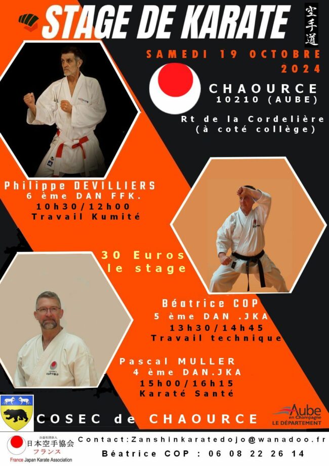 Samedi 19 Octobre : au Cosec : Stage national de Zanchin Karaté Dojo. Cours de karaté santé. Ouvert à tous ! Téléphone : 06 08 22 26 14 Cours avec : Philippe Devilliers 6ème Dan FFK de 10:30 à 12:00 > Travail / Kumité Béatrice Cop 5ème Dan JKA de 13:30 à 14:45 > Travail…