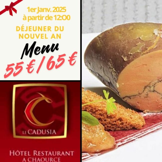Menu Nouvel An au « Cadusia » à partir de midi. Repas : Mise en bouche : Huître en gelée d’eau de mer – Tartare de Saint Jacques agrumes radis concombre sur sa raïta. Le Foie gras extra poire au vin et épices condiments noisette et sa brioche. Le bar poché au champagne coquillages/poireaux. En…