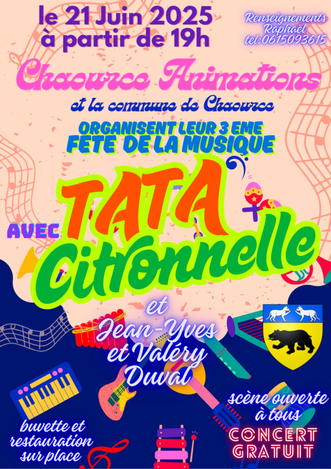 Fête de la Musique le 21 Juin 2025 à partir de 19h Chaource Animations et la Commune de Chaource organisent leur 3ème Fête de la Musique avec Tata Citronnelle et Jean-Yves et Valéry Duval. Buvette et restauration sur place. Scène ouverte à tous. Concert gratuit ! Merci d’avance pour tous ! Contact Mairie de Chaource…