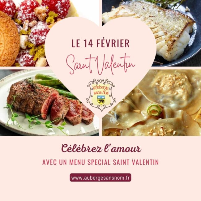 Menu Sain-Valentin ❤️❤️ Menu Spécial Saint Valentin ❤️❤️ Mercredi 14 février 2024 – Animée par Charlotte Menu à 55 € (entrée, plat, fromage, dessert) Ou Menu à 65 € (entrée, poisson, plat, fromage, dessert) Boisson non comprise Ravioles de confit de canard et foie gras, bouillon safrané et brunoise de légumes Filet de poisson blanc, espumas de lentilles corail…