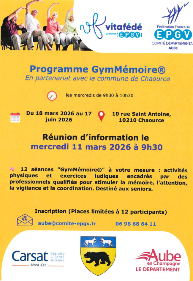 En partenariat avec la commune de Chaource Ce programme est destiné aux seniors et propose 12 séances alliant activités physiques et exercices ludiques pour stimuler la mémoire, l’attention, la vigilance et la coordination. Calendrier et Horaires Réunion d’information : Mercredi 11 mars 2026 à 9h30. Dates du programme : Du 18 mars 2026 au 17…