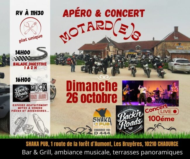 Rdv à 11:30 : Apéro & Concert Motards Plat unique. Ballade digestive (1 à 2 heures) A 16:00 : Concert Live (la 100ème) Exposez gratuitement, motos à vendre, pièces et accessoires Restauration sur place Réservation fortement conseillée ! Le Shaka Pub Bar & Grill, ambiance musicale, terrasses panoramiques. Parking dédié motos ! 📍: 1 route…