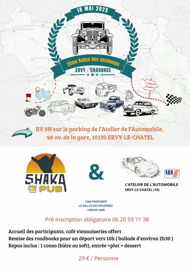 Rdv 09:00 sur le parking de l’Atelier de l’Automobile, 48 av. de la gare, 10130 Ervy-le-Châtel Le Shaka Pub & l’atelier de l’automobile Ervy-le-châtel (10) vous proposent le rallye des anciennes version 2025. Pré-inscription obligatoire 06.20.59.71.38 Accueil des participants, café viennoiseries offert Remise des roadbooks pour un départ vers 10h (ballade d’environ 2h30) Repas inclus…