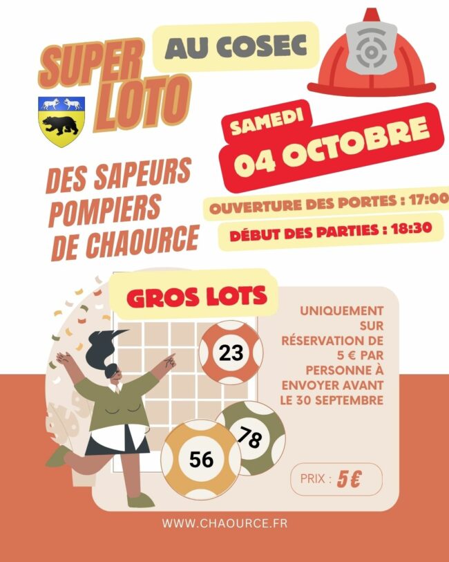 Super Loto des sapeurs pompiers de Chaource 6 parties adultes + 1 Loto Chinois 8ème Super Loto le Samedi 04 Octobre 2025 Lieu : Au COSEC de Chaource Ouverture des portes : 17:00 Début des parties : 18:30 1 carton : 5€ 3 cartons : 12€ 7 cartons : 20€ Gros lots : Robot aspirateur…